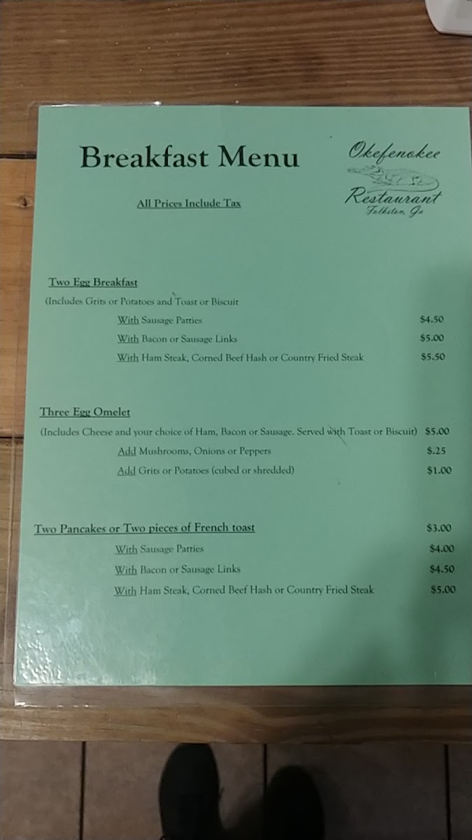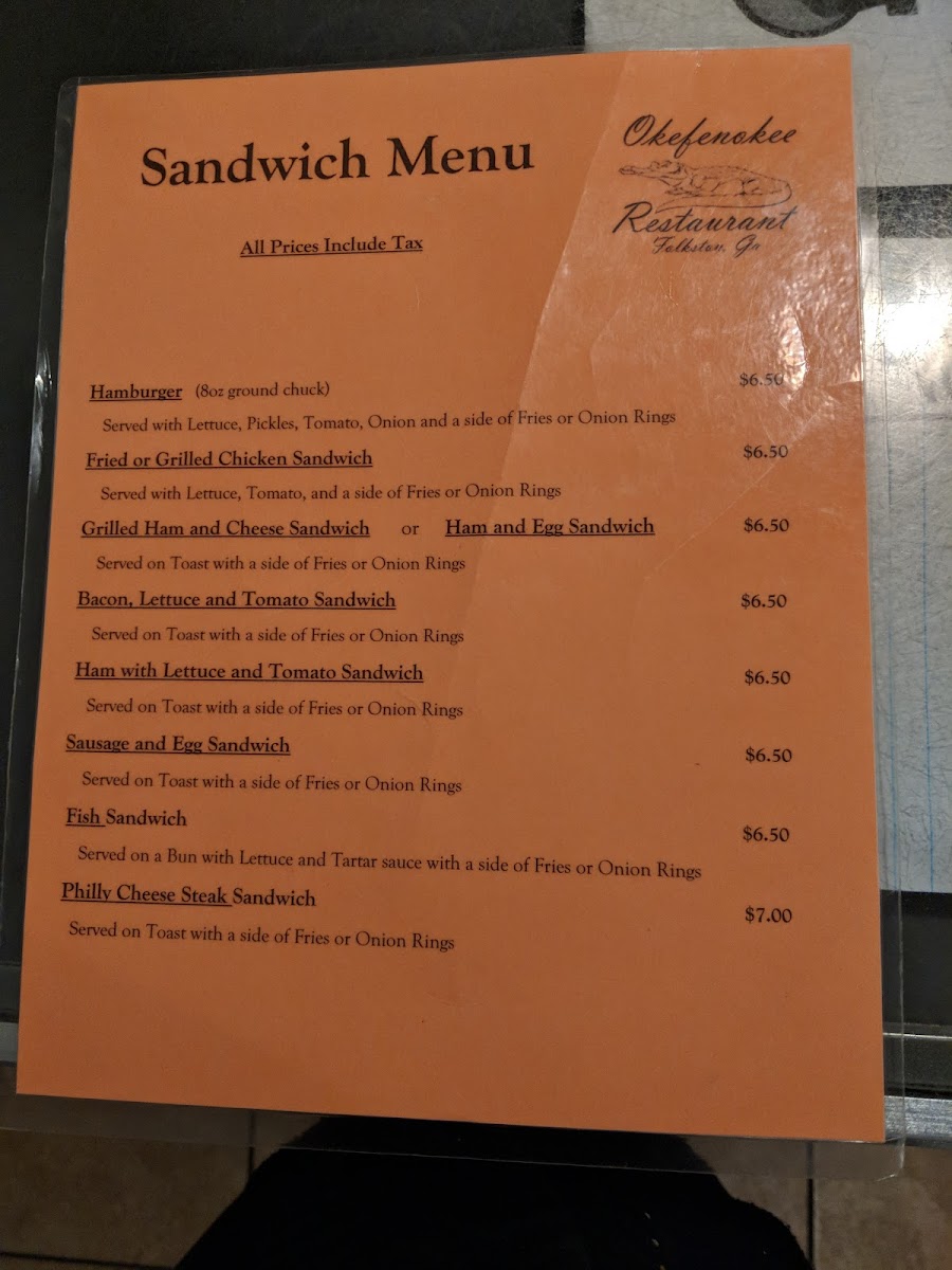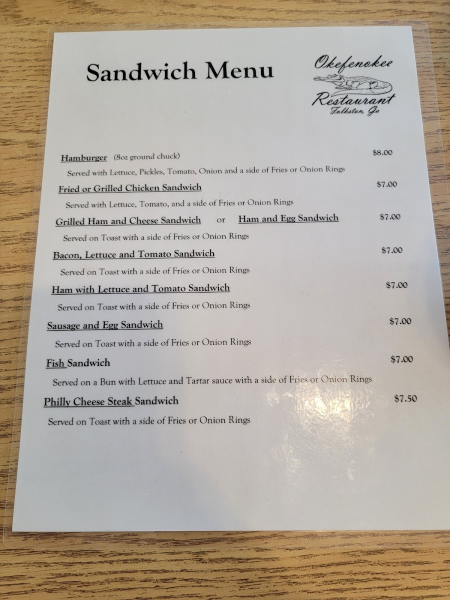 Okefenokee Restaurant Menu